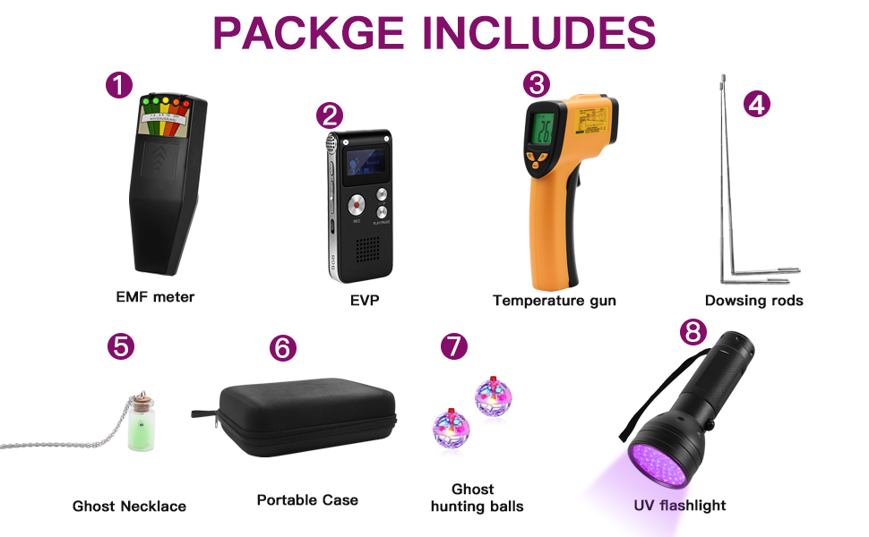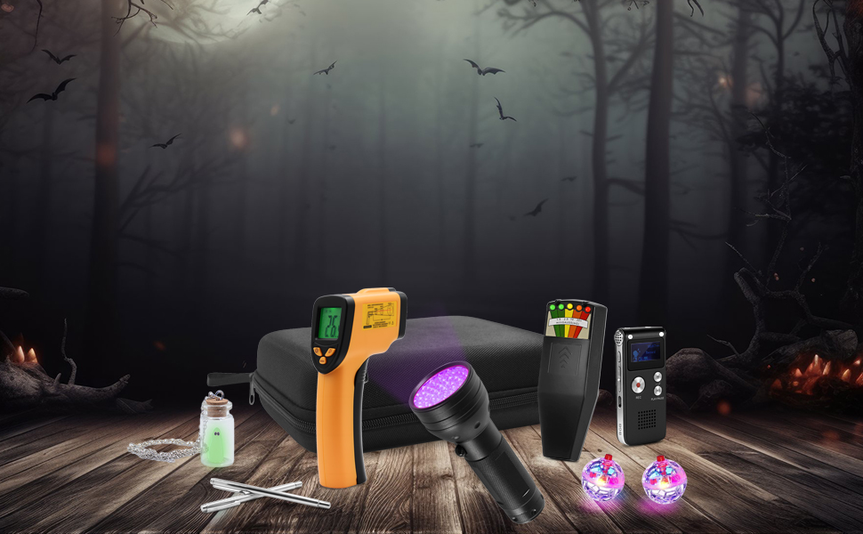 👻Professional ghost hunting tools:Including an EMF meter , EVP , infrared temperature gun, dowsing rods, and UV flashlight – Crafted for imaginary paranormal escapades and fun—with no assertions of scientific validity.