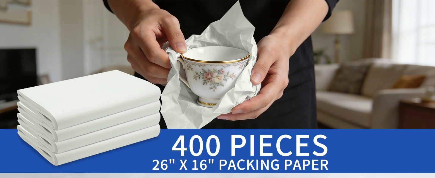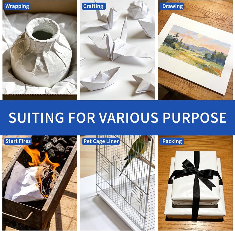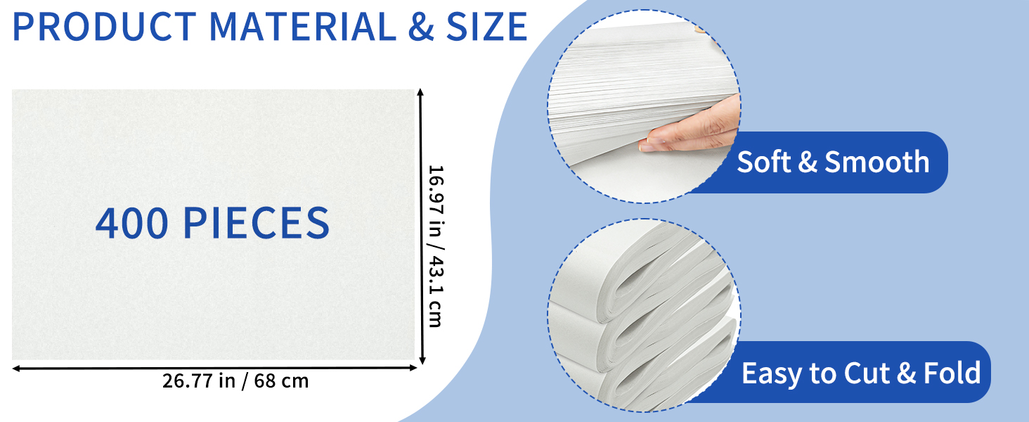 Quantity&Size: Package include of 400 pack white packing paper, per measure is 26.77 in L x 16.97 in W ( 68 cm x 43.1cm), adequate quantities, meeting various packaging requirement