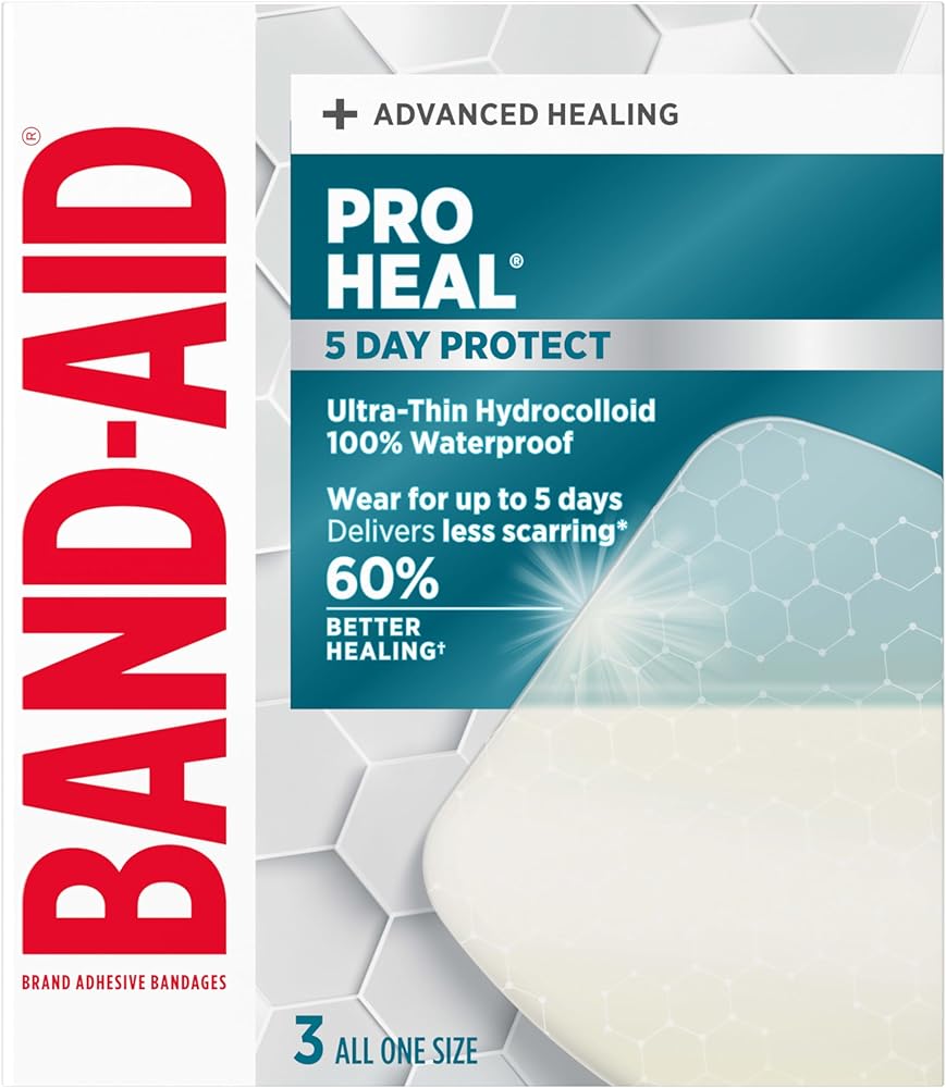 Help heal minor everyday cuts and scrapes better with BAND-AID Brand PRO HEAL Advanced Healing Ultra-Thin Hydrocolloid Bandages. Wear for 5 days for less scarring*. Clinically tested to deliver less scarring* and 60 percent better healing**, these 100 percent waterproof bandages stay in place for up to 5 days, protecting wounds even through handwashing and showering. The advanced healing hydrocolloid bandages absorb fluids, seal out water, dirt, and germs, and maintain an optimal environment for better wound healing. The flexible, ultra-thin material adheres comfortably to fingers, elbows, and knees, and the almost clear bandage blends with skin for a barely there look and feel. Each sterile bandage is individually wrapped for convenient, hygienic use at home or on the go. For best results clean the wound, skip ointment, and leave the bandage on until it starts to lift naturally. *Versus uncovered wound. **Based on a 7-day average of subjects showing improvement vs standard care.