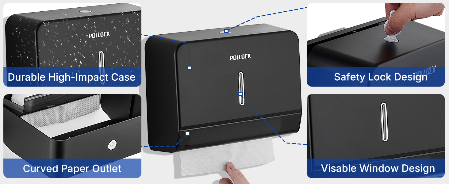 4. Locking Key Design: This paper towel dispenser wall mount features a lock design to ensure minimal pilferage and waste reduction. It is an ideal accessory for high-traffic public places, including restrooms, schools, banks, hotels, shopping malls, bars, food service facilities, and medical facilities.