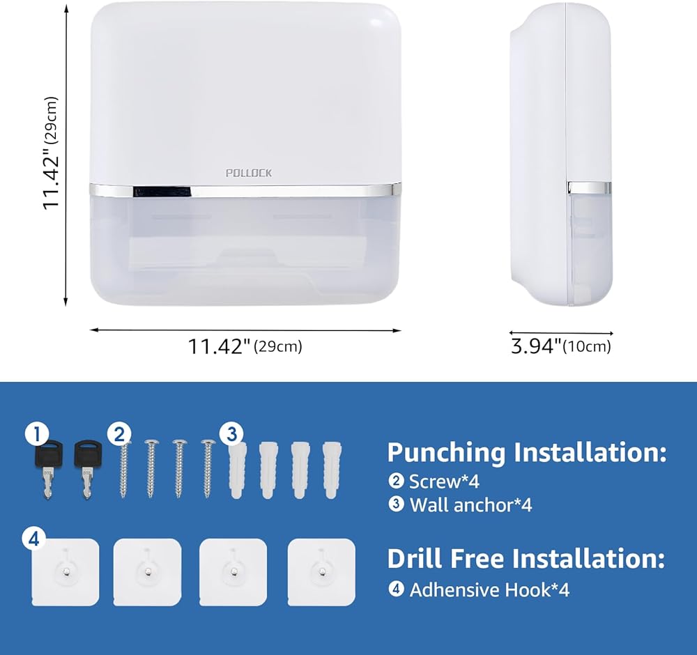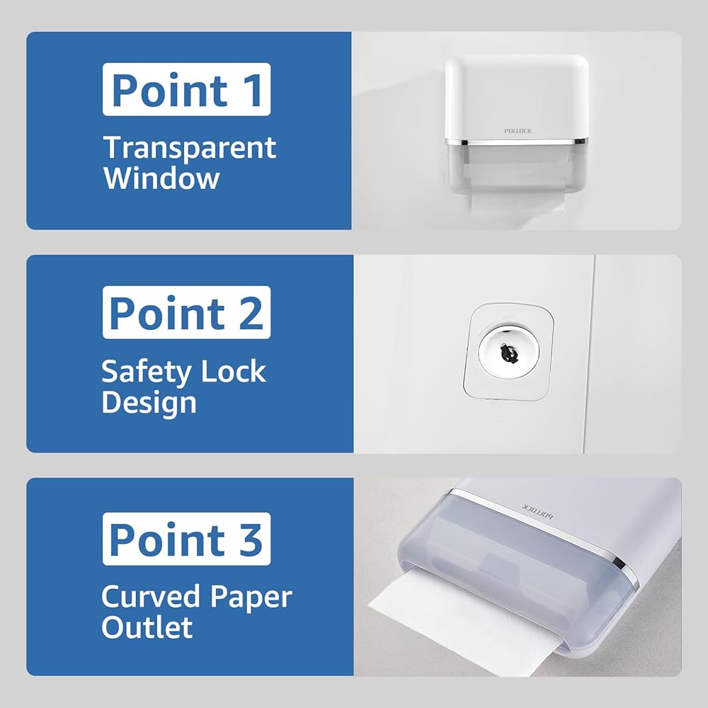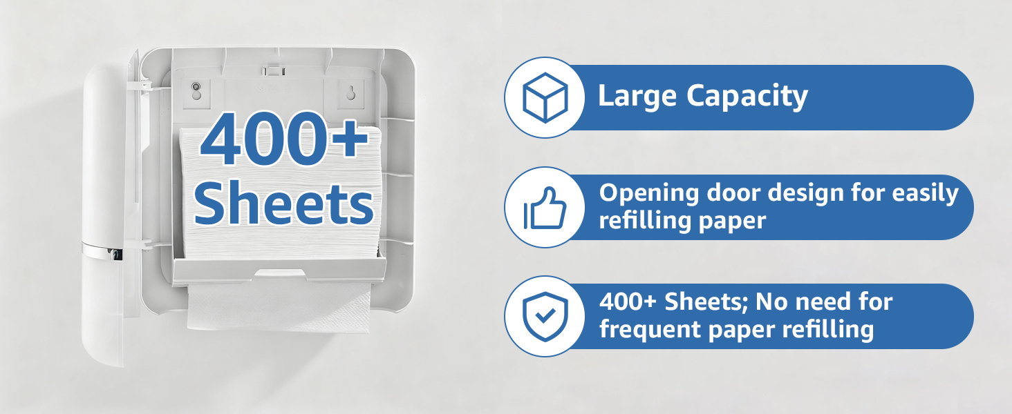 2. Large Capacity & Space Saving: paper towel for dispenser's compact wall mount design is a nice advantage as it helps to save space; High capacity for holds up to 400 folded tissues. Folded size smaller than 6.69"x 3.94“or small can be dispensed smoothly with the dispenser.