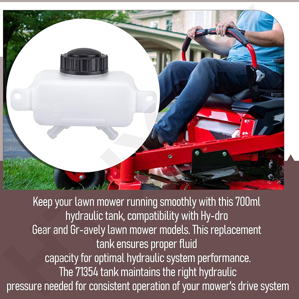 Keep your lawn mower running smoothly with this 700ml hydraulic tank, compatibility with Hy-dro Gear and Gr-avely lawn mower models. This replacement tank ensures proper fluid capacity for optimal hydraulic system performance. The 71354 tank maintains the right hydraulic pressure needed for consistent operation of your mower's drive system. Perfect for maintenance and repairs, this tank helps restore your mower's functionality to keep you moving efficiently across your lawn. Built to meet the specifications of compatible models, this hydraulic tank provides reliable fluid containment and distribution. Whether you're a professional landscaper or a homeowner maintaining your yard, this tank offers the durability and functionality needed for your mower's hydraulic system