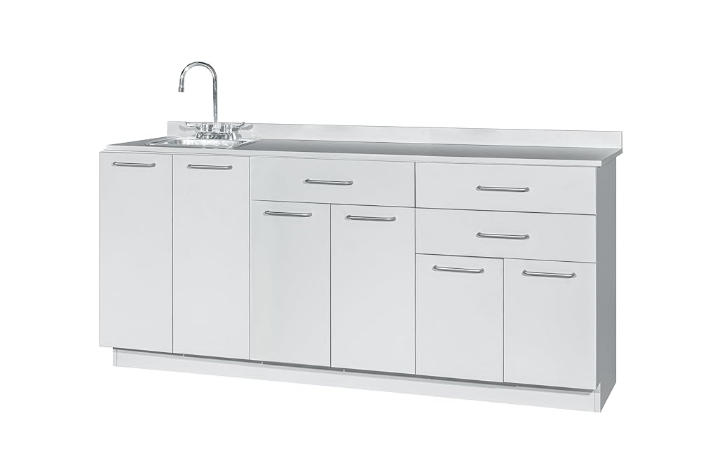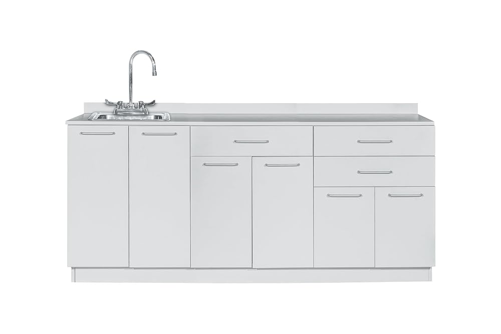 STAINLESS STEEL SINK SYSTEM – Integrated stainless steel sink with dual-handle gooseneck faucet provides reliable performance for daily handwashing, instrument rinsing, and clinical use in exam rooms and clinical settings.
