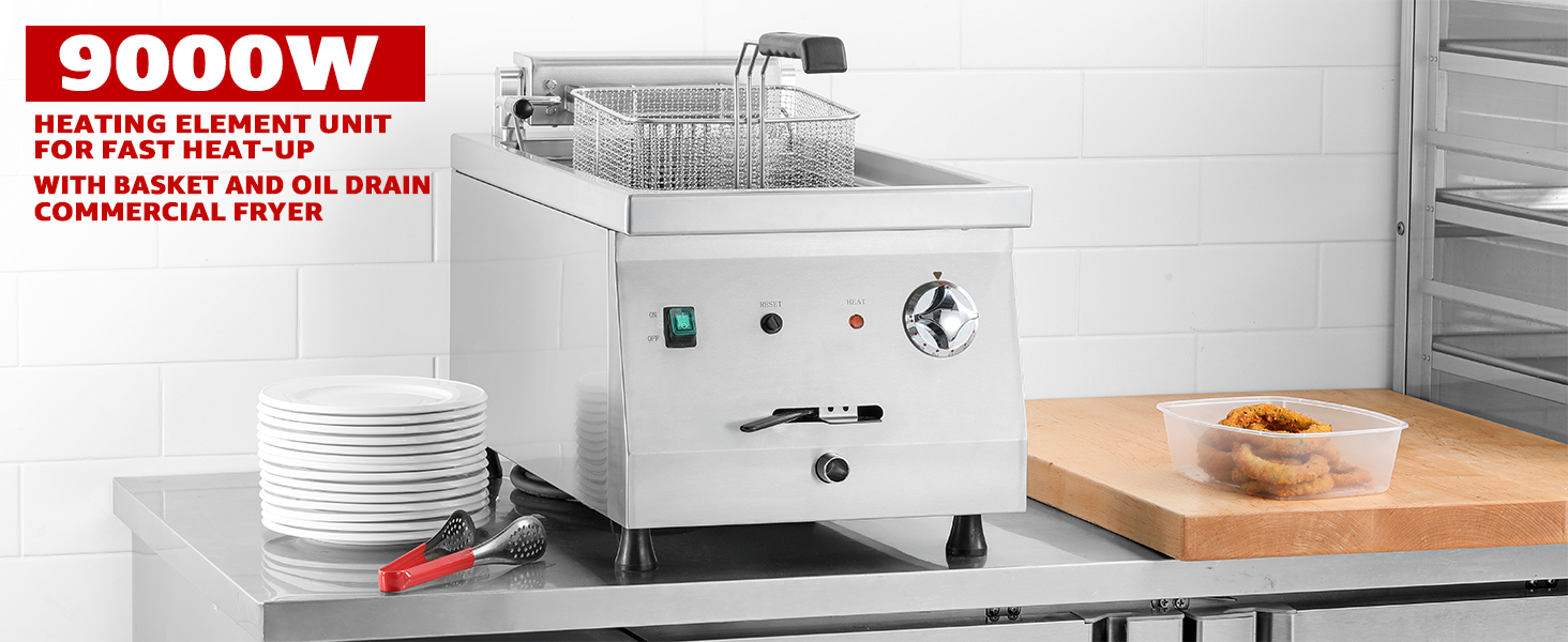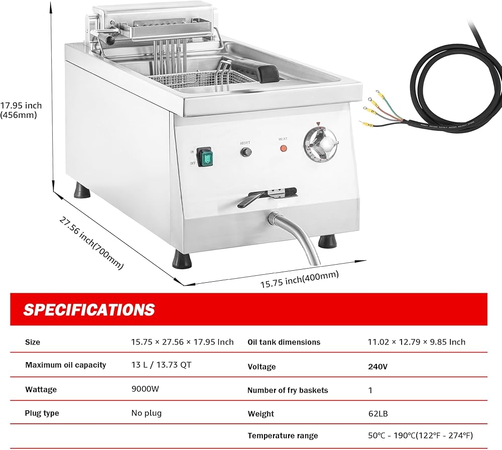 9000W Commercial Fryer: The electric fryer is equipped with a 9000W heating element, ensuring efficient and rapld heat-up. It is compatible with a voltage range of 208V to 240V. The professional electric deep fryer is ideal for used in commercial establishments such as restaurants and large catering companies. Its versatility allows it to meet diverse frying requirements