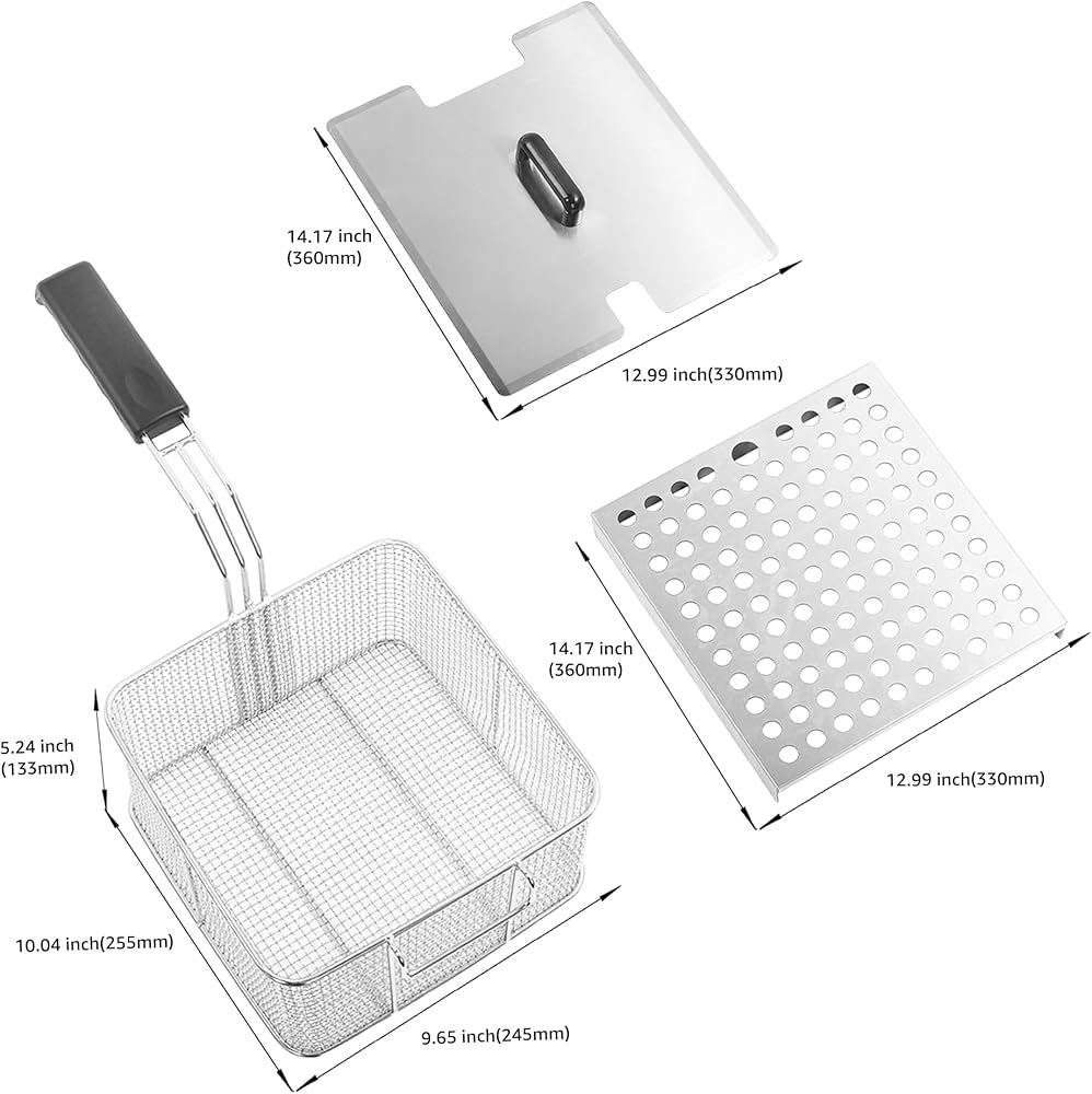 13L(13.73QT) Large Oil Capacity: The electric deep fryer comes with a 304 stainless steel oil tank, a night cover and a basket. The cool-touch handle ensures a comfortable grip, while the hooks on the front of the basket allow for easy strain of excess oil. The oil tank design includes a shallow transitional zone, providing a buffer area for frying operations or when oil boils