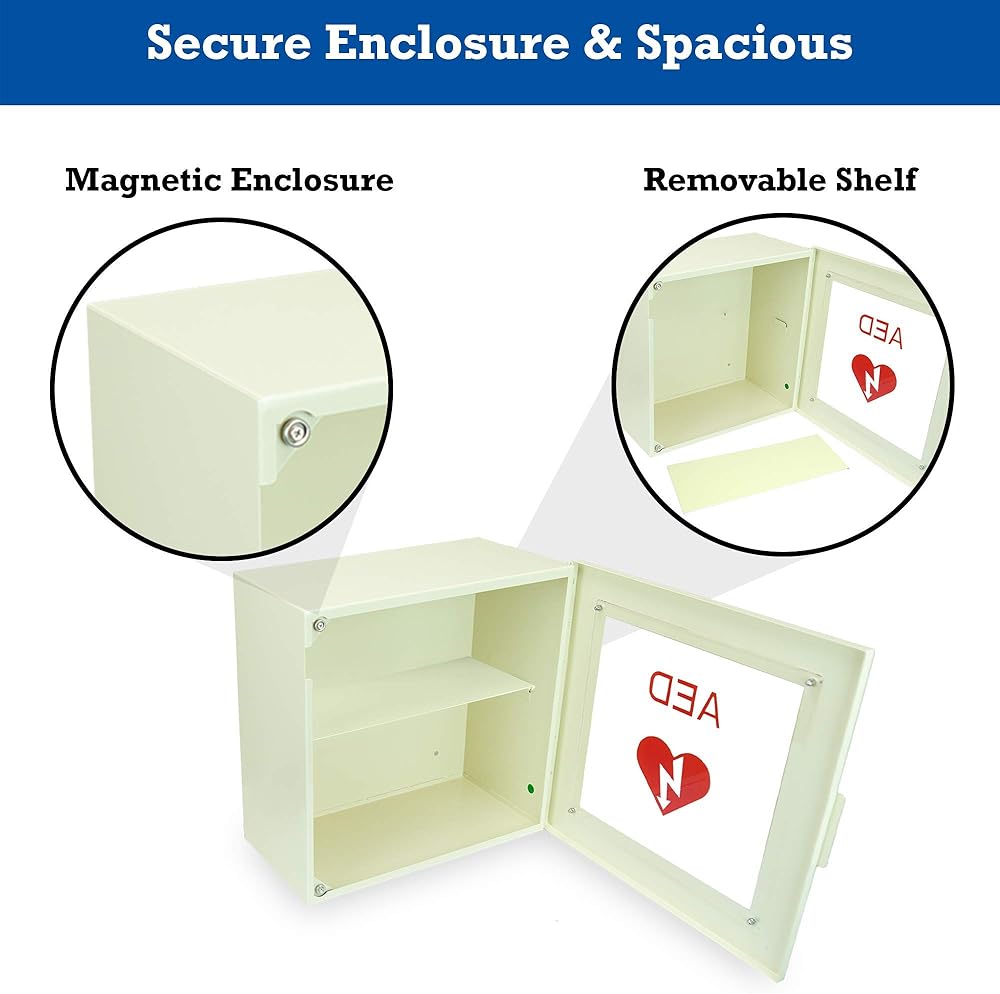 FITS MOST AED DEFIBRILLATOR: Measuring 14.1" (H) x 7" (W) x 13.75'' (H), this AED storage cabinet is fits for most AED defibrillator. In addition, there is a removable shelf inside, which is convenient for storing various types of defibrillators and AED supplies.