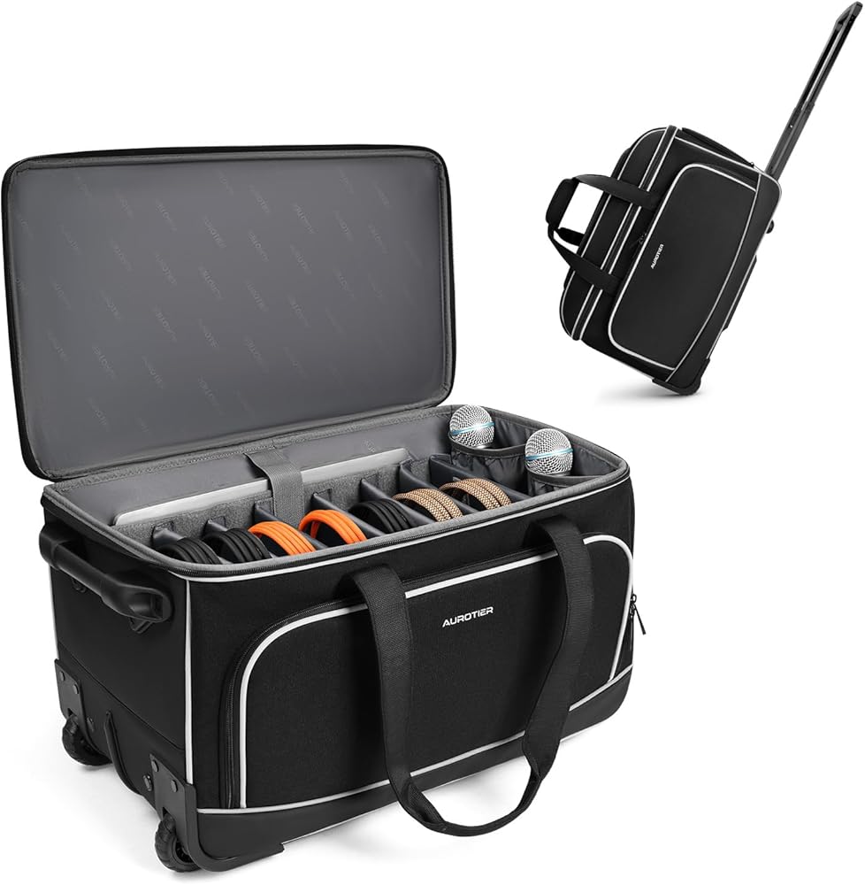 Large Rolling DJ Cable Bag with Wheels, Reinforced Padded Gig Bag with 8 Detachable Divider, Multi-Pocket for 17" Laptop, Microphone, Cord, Headset & Music Accessories