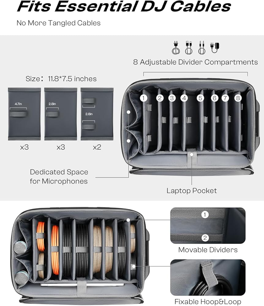 【Well-Organized Storage with Movable Divider】 This DJ Cable Bag with wheels features a large main compartment with a dedicated laptop pocket, side pockets for microphones, and 8 thick foam-padded removable dividers. Each divider is built with hook-and-loop fasteners, allowing them to stay securely in place without shifting during movement. Customize up to 8 organized sections for DJ gear, cables, and DJ accessories equipment. The top compartment includes two mesh pockets, plus two side zip pockets for quick-access storage