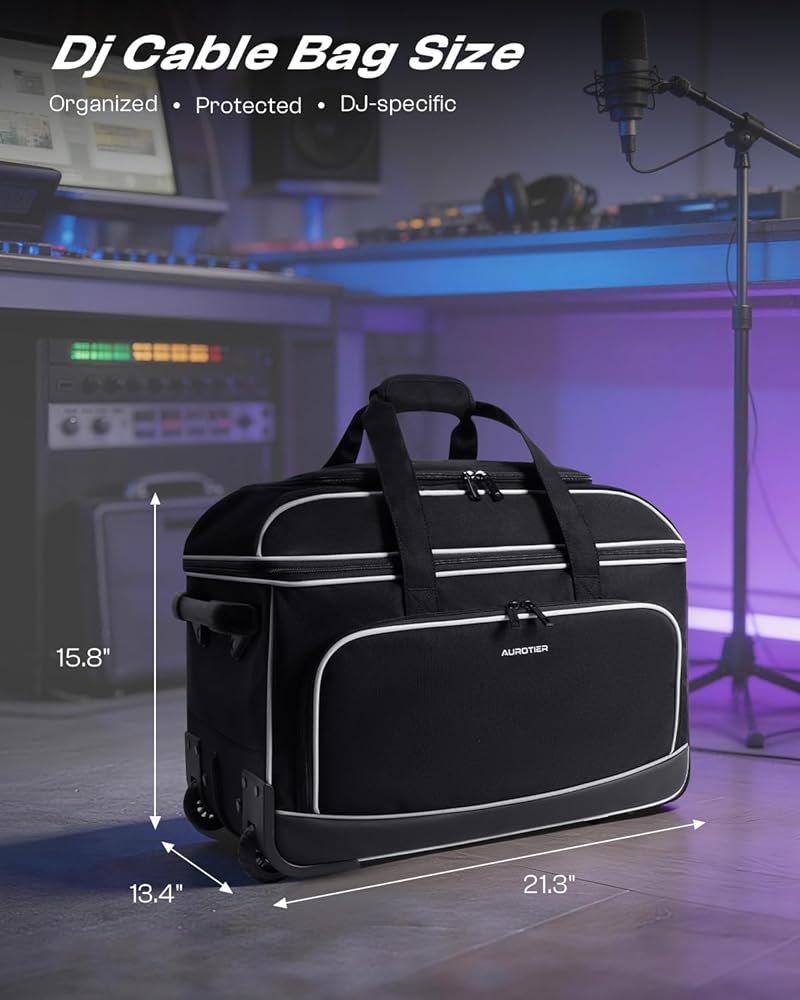 【Large Capacity Rolling DJ Cable Bag】 This rolling DJ Cable Bag measures 21.3 x 13.4 x 15.8 inches, offering ample space for DJs who need to transport multiple cables and gear. The integrated wheels are built directly into the bag for smooth rolling and long-term durability, making this DJ cable bag ideal for frequent gigs, travel, and touring use