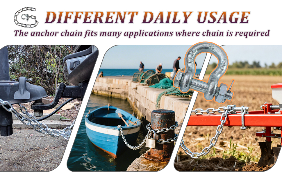 MULTIFUNCTIONAL CHAIN:Apart from using for boats anchor chain, the chain fits many applications where chain is required, such as home gym, securing a farm gate, swing chains, pull chain on your tractor, rode chain, ect.