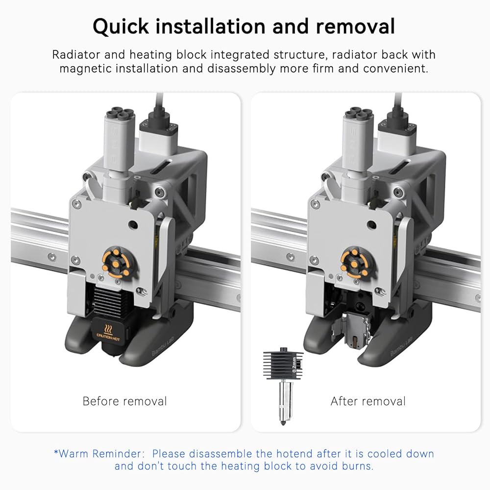 Magnetic Quick-Swap for Tool-Free Installation – Built-in magnetic alignment blocks let you snap the hotend into place in seconds. Always cool the hotend before swapping to avoid burns—easy, safe, and efficient.