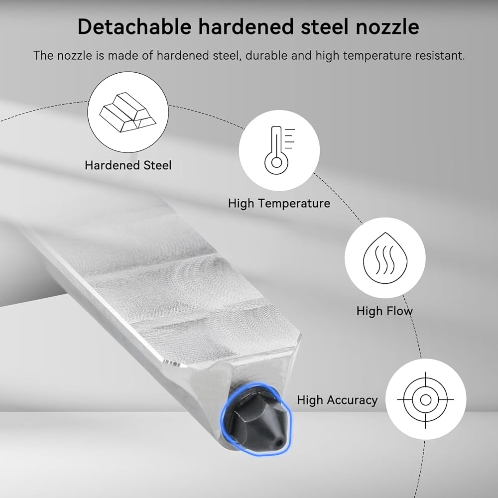 Super Durable Hardened Steel Nozzles – Crafted from SKD11 hardened steel (HRC60+ hardness), these nozzles feature smooth inner walls to reduce clogs. Rated for 500°C high-temp printing, they outlast standard nozzles and resist wear from long-term use.