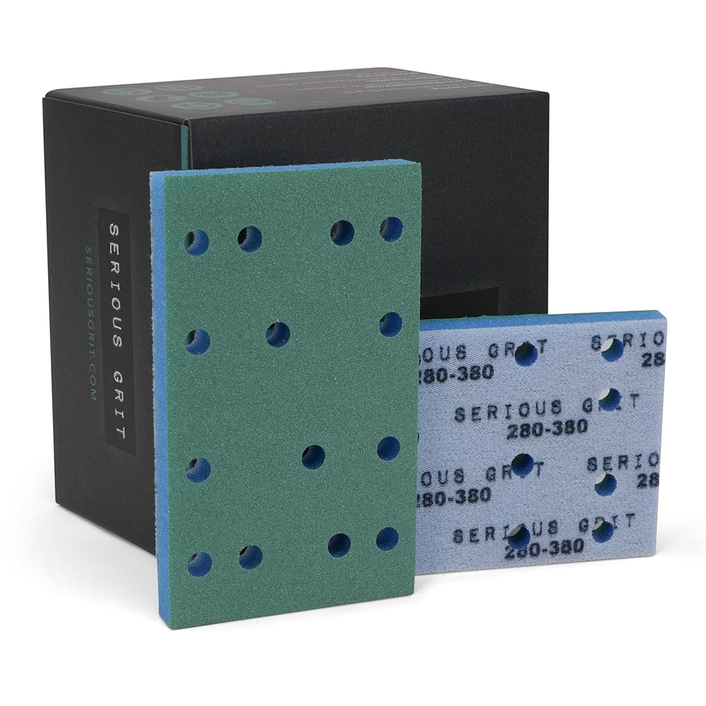 Serious Grit 3" x 5" P150-180 foam sanding pads are designed for ultra-flexible sanding with Festool RTS 400, Mirka DEOS 353, and other 80x133mm sanders with 14-hole hook & loop interfaces. These pads use a 1/2" low-density open-cell foam that conforms easily to curves, profiles, and moldings without cutting through edges or high spots. Ideal for refining primer or smoothing wood grain around moldings, curved surfaces, or edges, the premium silicon carbide abrasive cuts cleanly and evenly across a variety of surfaces. Hook & loop backing allows quick pad changes, and the foam construction supports both wet and dry use for versatile performance.