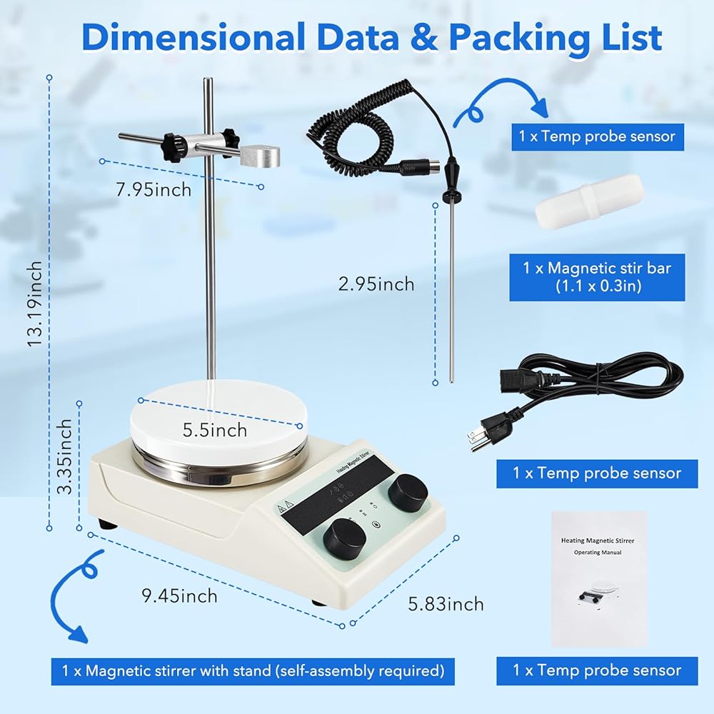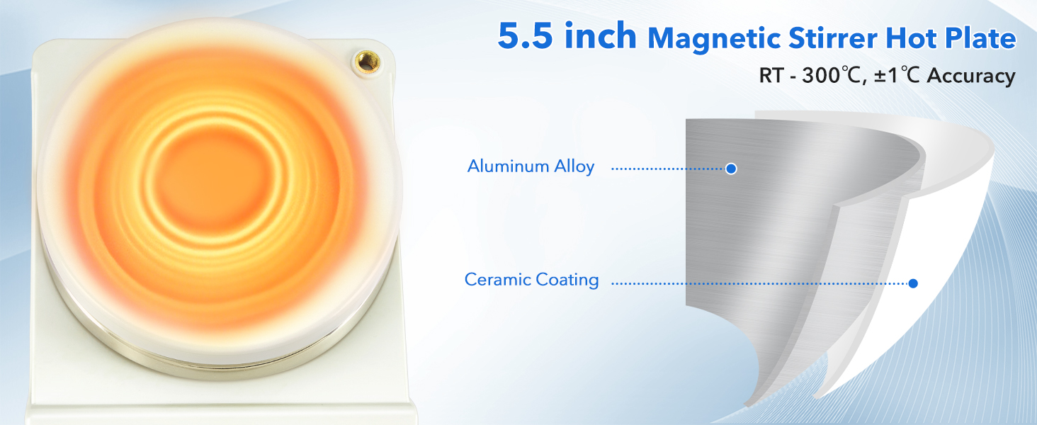 Rapid Heating & Precise Temp Control: 5.5inch aluminum heating panel with ceramic coating, provides perfect heat conductivity and strengthens the durability of magnetic stirrer. Heating temp range: Ambient to 300℃/ 572℉. ±1°C accuracy through integrated PID control. Equipped with an external temperature probe (please use the included bracket for installation). The actual temp is displayed through the LED display, ensuring experimental data visibility