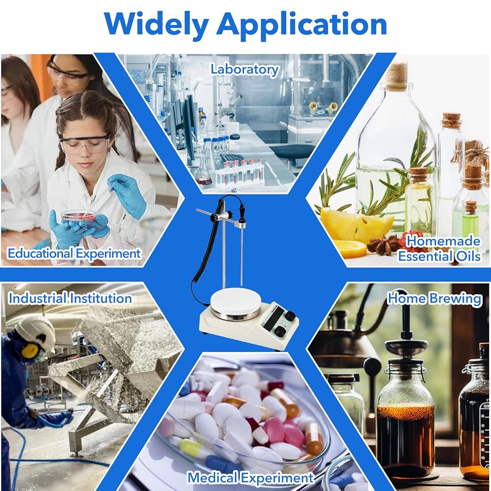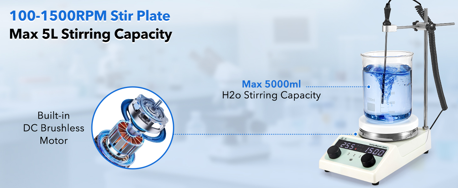 Powerful Stirring Performance: This blender has a built-in DC brushless motor with a maximum stirring capacity of 5000 ml (water), 100-1500 rpm range via knob control. Enables independent or simultaneous stirring/heating operations to meet different experimental needs
