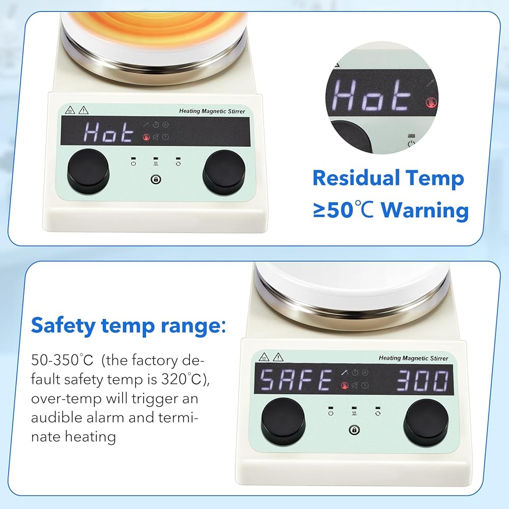 Safety In Use: The stirrer has safety protection function: 1. After shutting down, as long as you don't unplug the power supply, when the panel residual temp is higher than 50 ℃, the screen will always show "Hot", to avoid the contact bringing harm. 2. Safety temp range: 50-350 ℃ (the factory default safety temp is 320 ℃), triggering audible alarms and automatic heating termination upon exceedance, ensuring sample protection