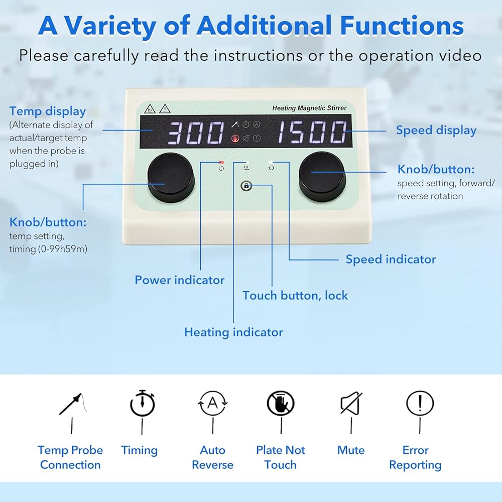 A Variety Of Additional Functions: In addition to the above functions, our magnetic stirrer also has a timing function: 0-99h59m. timing function, stirrer forward and reverse settings, locking knob function, and so on. Please carefully read the instructions included in the package or the operation of the instructional video