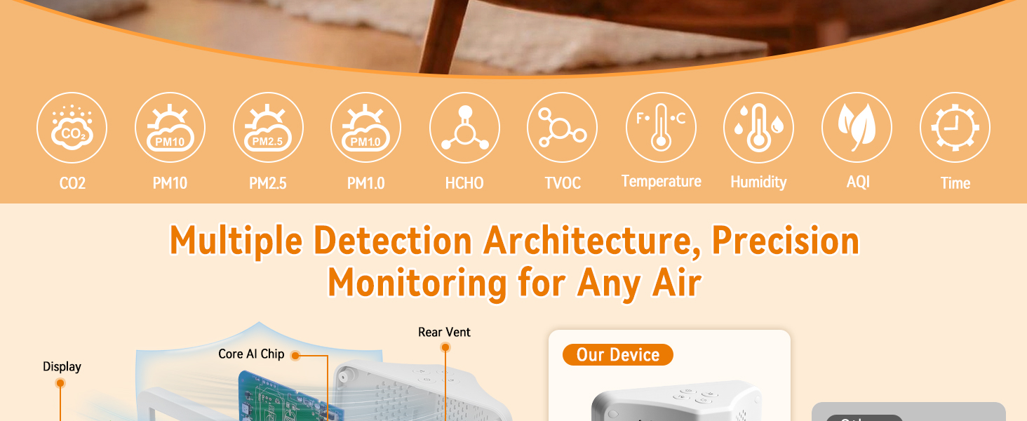 Large Clear Display for Easy Monitoring: The large screen displays CO2 concentration, particulate matter levels, temperature, humidity and AQI status in one glance. Designed for simple and convenient daily air quality monitoring