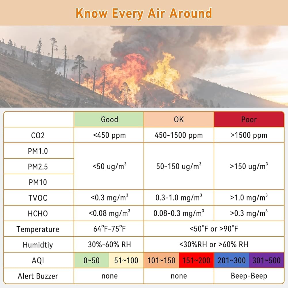 Portable Rechargeable Air Quality Monitor: With a built-in rechargeable battery, this portable air quality monitor is perfect for homes, offices, baby rooms, RV travel and camping, allowing you to monitor air quality anywhere