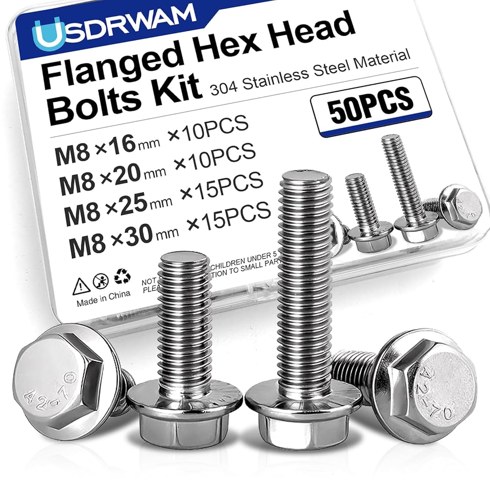 Product Title: M6 Stainless Steel Flanged Hex Head Bolts Kit 20mm – 304 A2-70 Grade, 50PCS – Rustproof Fasteners for DIY, Automotive & Industrial Use Key Features (Bullet Points): ✅ Complete Metric Kit: Includes 50 flanged hex bolts in 4 sizes – M6×20mm – ideal for diverse projects requiring durable, corrosion-resistant fasteners. ✅ 304 Stainless Steel: Built to last with A2-70 strength, superior rust & chemical resistance, and slight magnetism for reliable performance in harsh environments. ✅ Anti-Loose Flange Design: Integrated serrated flange increases grip and distributes pressure evenly, minimizing vibration-induced loosening for secure, long-term fastening. ✅ Wide Compatibility: Precision metric threading and standard hex heads fit most wrenches (sold separately). Perfect for machinery, automotive repairs, marine equipment, home DIY, and industrial maintenance. ✅ Convenient Storage: Packaged in a reusable transparent case for easy organization, quick access, and portable toolkits. Product Description: Upgrade your toolkit with this premium 50-piece M8 stainless steel flanged hex head bolt set, engineered for durability and versatility. Crafted from 304-grade stainless steel, these bolts withstand corrosion, chemicals, and wear, making them ideal for indoor/outdoor use in humid, high-stress, or temperature-variable conditions. The A2-70 strength rating ensures they meet industrial standards for heavy-duty applications, while the flanged serrated design enhances stability by expanding the contact surface. This reduces the risk of loosening under vibration, securing joints in automotive parts, machinery, furniture, or marine fixtures. Each bolt features a standard hexagonal head for compatibility with most hex keys or wrenches, simplifying installation. The set's four lengths (16mm, 20mm, 25mm, 30mm) and clear case make it a go-to solution for professionals and DIYers tackling repairs, renovations, or custom builds.