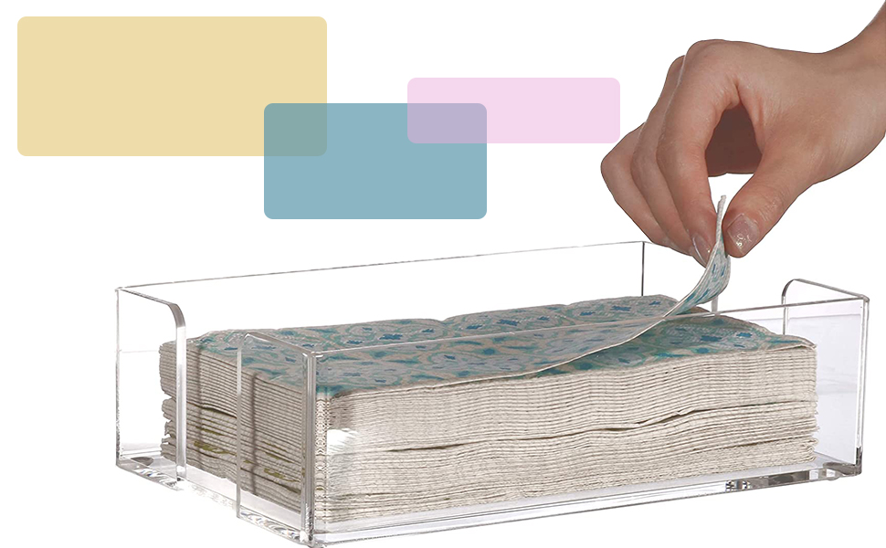 【Universal Design】the Clear Napkin Holder is wide enough to hold lots of disposable towel ,Size 9.5″Lx5.5″Wx2.5″H(Inside: 9 Lx5.2 Inch W),It can hold such as 7.5''x4.25" folded dinner napkins and 8.5”x4.25” folded disposable guest hand towels