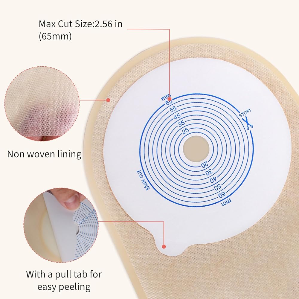 One-Piece Stoma Bags: Our ostomy supplies are equipped with a cut-to-fit barrier, suitable for stoma sizes from 0.59" (15 mm) to 2.56" (65 mm). Use the included stoma measuring plate to measure your stoma, then cut the barrier to fit your exact stoma dimensions