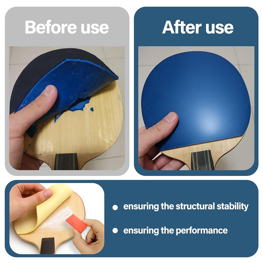 Table tennis glue forms a flexible and durable adhesive layer between the rubber and the blade, withstanding the strong impact and bending of powerful shots, maintaining its elasticity for a long time, effectively preventing edge separation, and ensuring the structural stability and performance of the racket.