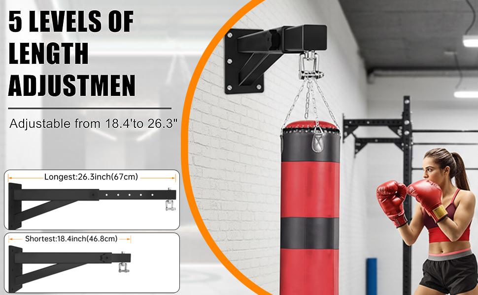 【Adjustable Design】 The length of the punching bag hanger can be continuously adjusted between 18.4 and 26.3 inches. The adjustment system replaces traditional pins with a unique spring-loaded knob mechanism; simply turn and pull to change the length in seconds