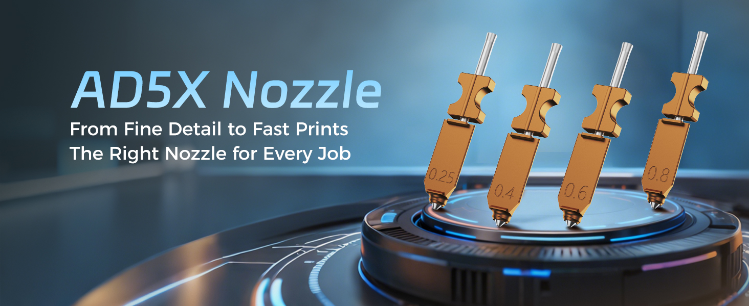 Multiple Nozzle Sizes – Available in 0.25 mm, 0.4 mm, 0.6 mm, and 0.8 mm diameters to meet different printing needs, from ultra-fine detail to fast, large-scale models.