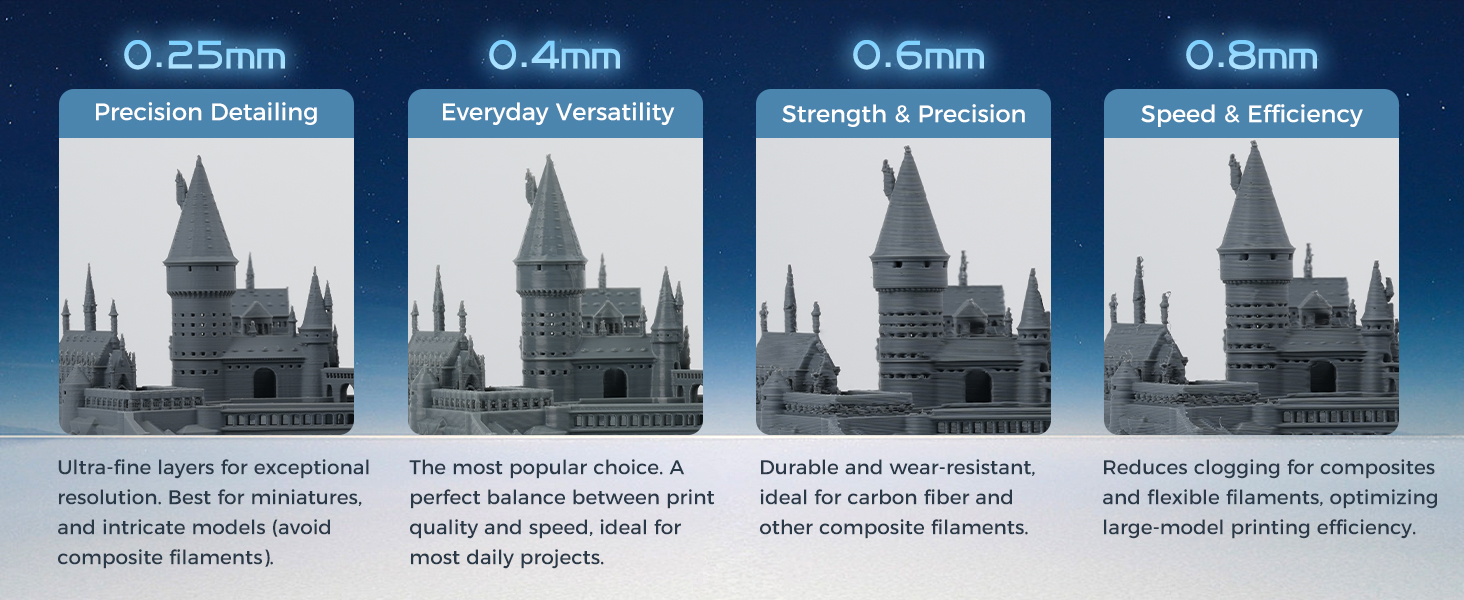 Material-Specific Options – 0.25 mm and 0.4 mm nozzles are recommended for PLA, PETG, and ABS, while 0.6 mm and 0.8 mm nozzles are ideal for carbon fiber, glass fiber, and other abrasive composites.
