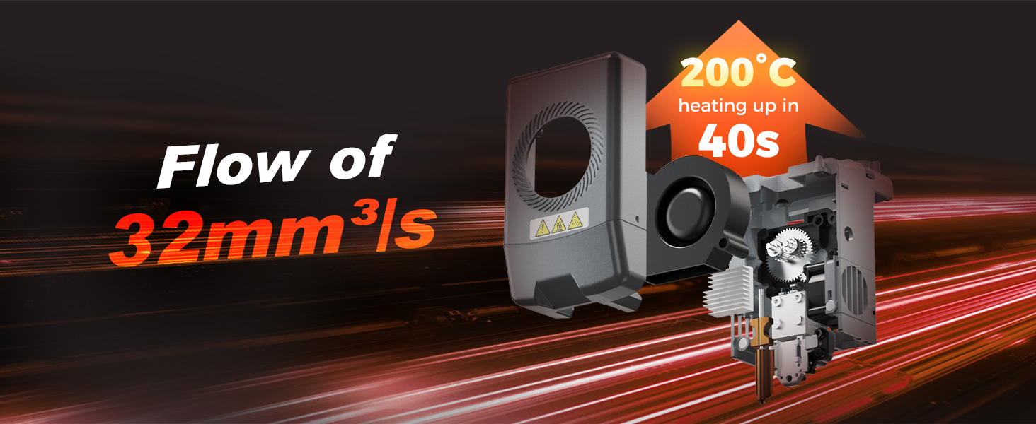 Efficiency. Flashforge Nozzle offers flow of 32mm³/s, 200˚C heating up in 40 seconds.