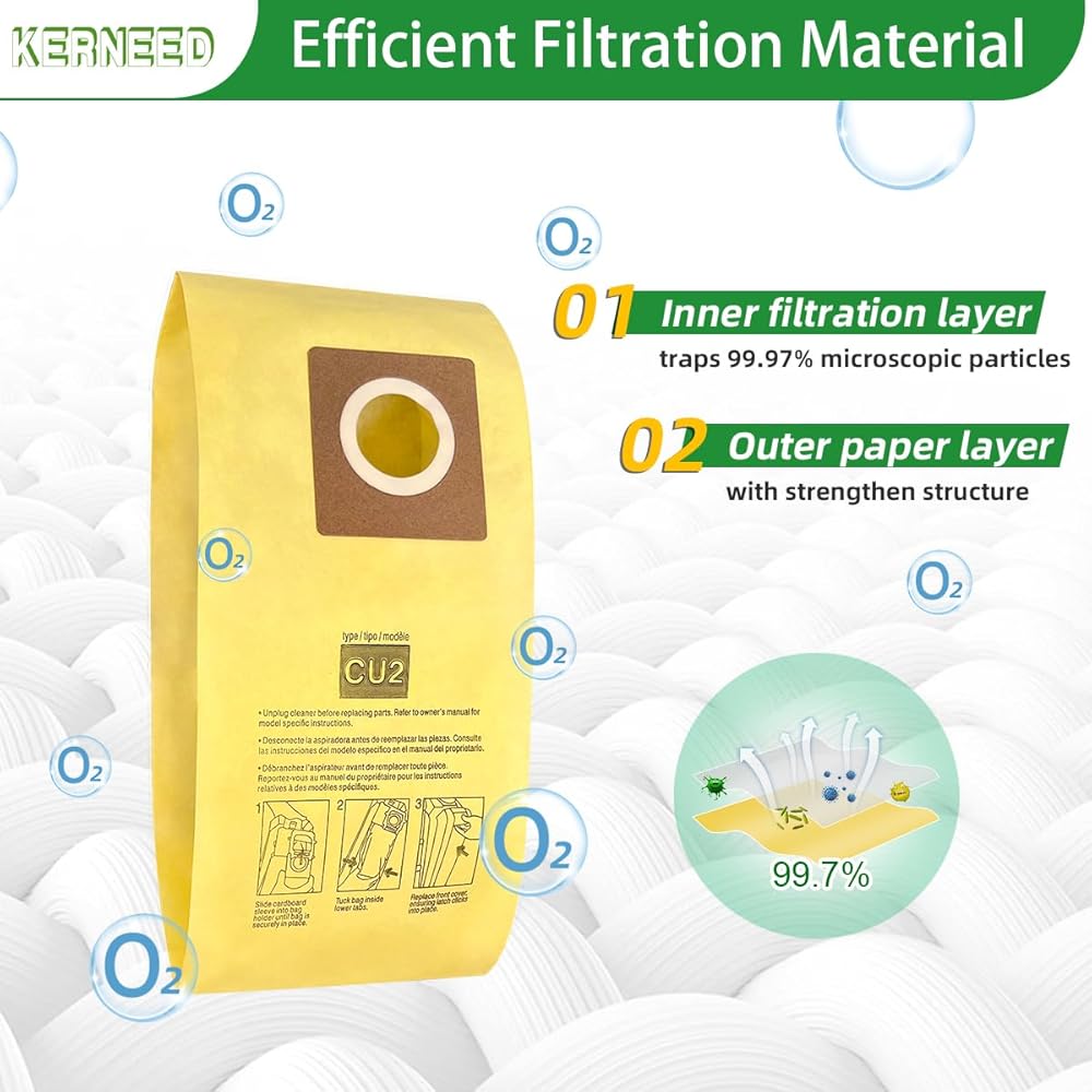 𝗦𝘁𝘂𝗿𝗱𝘆 𝗦𝘁𝗿𝘂𝗰𝘁𝘂𝗿𝗲: Adopts premium double-pleated laminated inner linings. Sturdy and thick enough for the long-term use and not easy to get leak or burst when vacuuming. Built-in rubber gasket to help the bag fits tightly into the vacuum.
