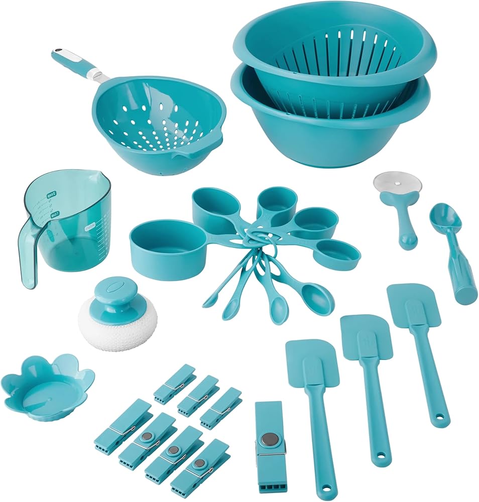 This 28-piece plastic kitchen tools set includes all the essentials for everyday cooking and baking. From measuring cups and spatulas to a pizza cutter and colander, it's a complete solution for starter kitchens or refreshing your kitchen drawer.