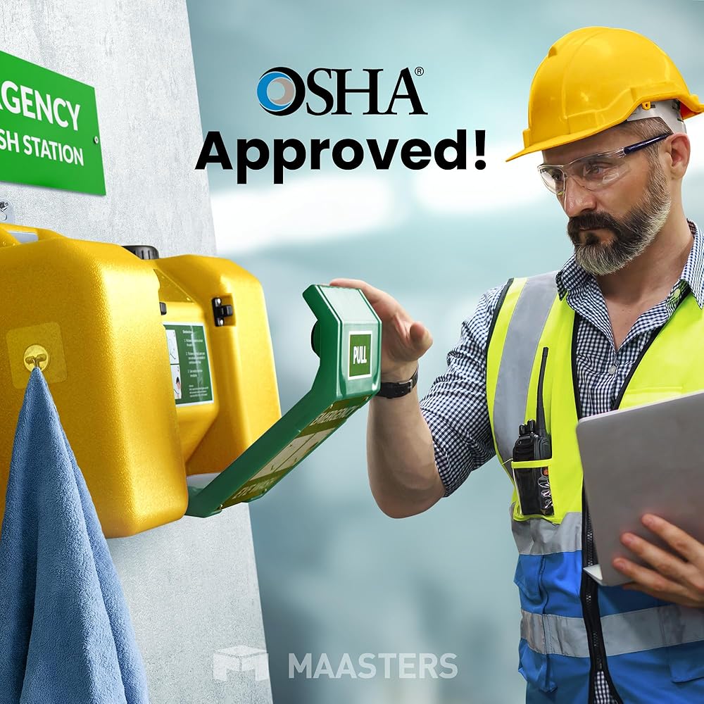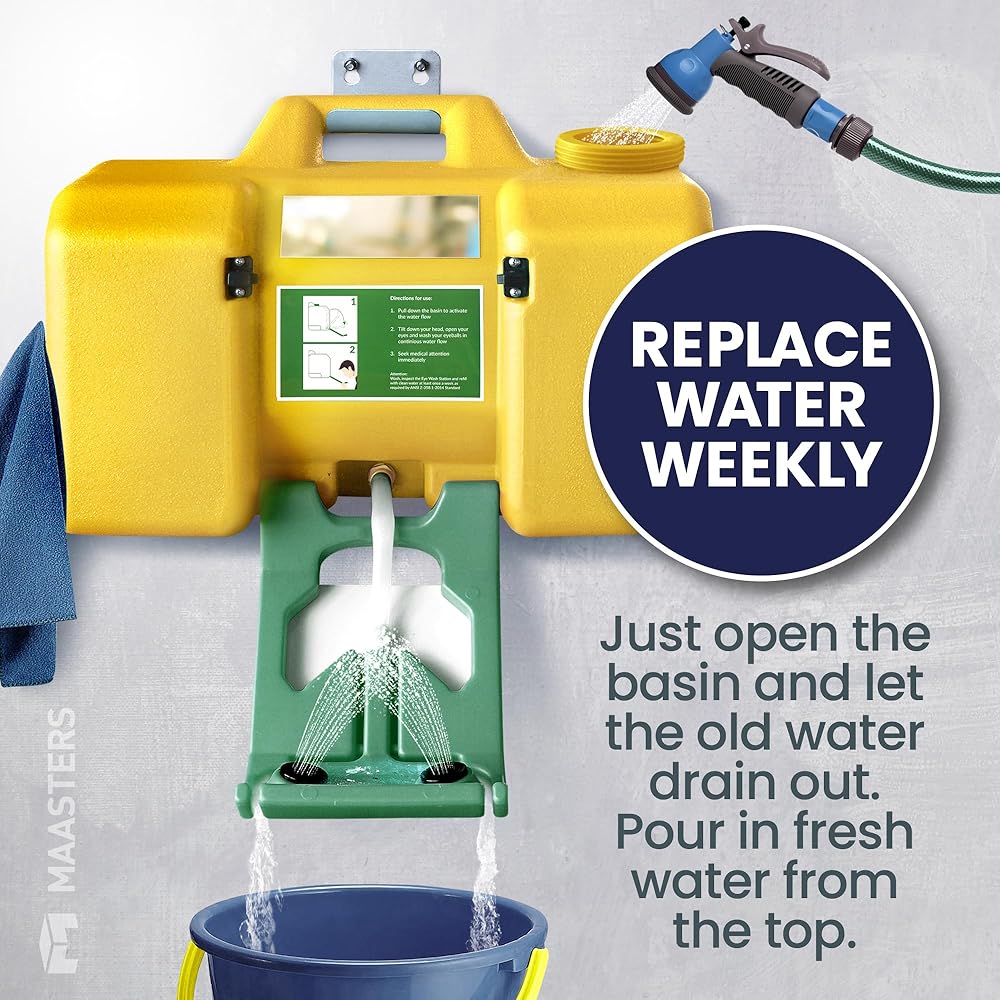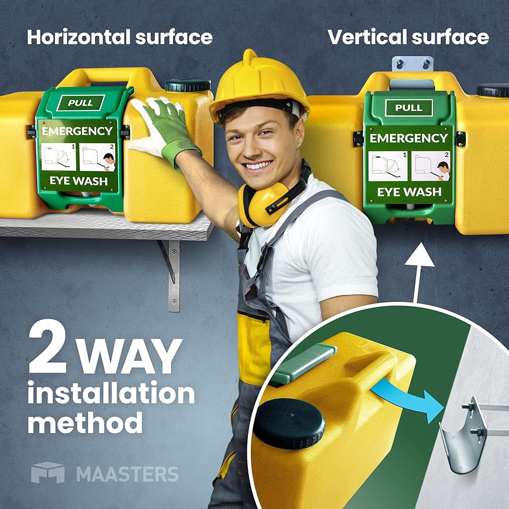 Emergency Eye Washing Station This is a portable eye wash station featuring all the elements you need for it to function effectively. This includes dual spray nozzles, user instructions, a pull sign and a mirror for checking your eyes after a flush. For labs, garages, and construction sites, it's an utter essential. OSHA-Approved Our eye wash units are OSHA-approved, making them a great solution for passing your workplace safety inspections, whether working in a truck garage, a medical facility, or a construction site. 2 Installation Styles You can set up this portable eye wash kit in no time, whether you position it on a shelf or as a wall-mount unit in a matter of minutes. Automatic Water Flow All you have to do is open the basin on this eye-washing station to start 15 minutes of uninterrupted water flow. No more using a cup or bottles to clear out your eyes in an emergency! Remember, refill it with pure water weekly to keep things properly clean. Sign Included The naked human eye of your employees will be able to spot this station across the workplace, with a sign included for setting above the unit. How to Set Up Below we've included the simple, yet detailed steps involved in setting up this portable eye wash station. By following these steps, you'll have your eye wash kit up in a matter of minutes. Hooks Included Along with the mirrors and signage included with this portable eye wash kit, we've also included hanging hooks for the sake of drying towels that you can use for your eyes after a rinse.