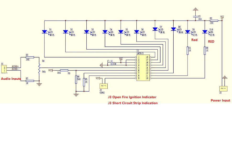 - Audio input: 0 ~ 1.5Vrms Two indication modes: strip instructions and Spot Indication (implemented by the MOD circuit point)