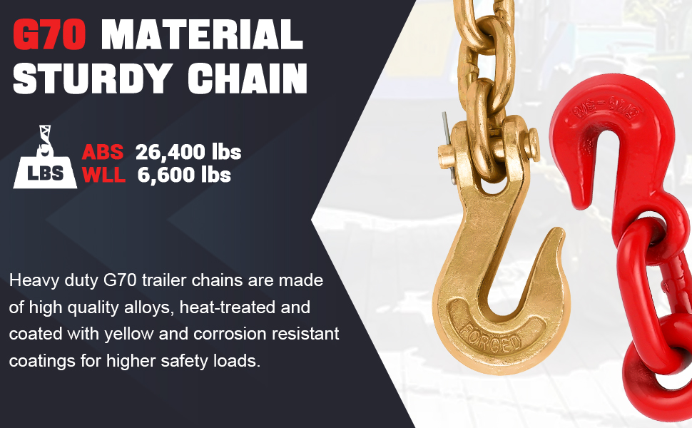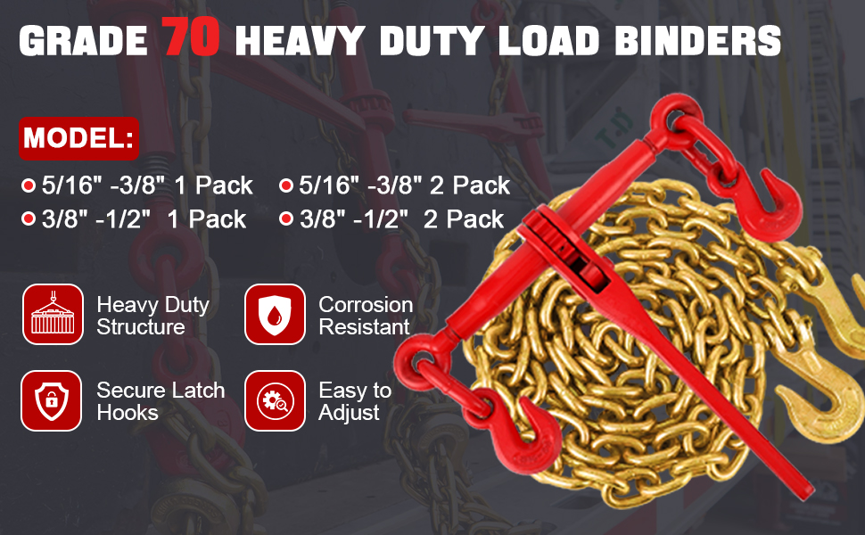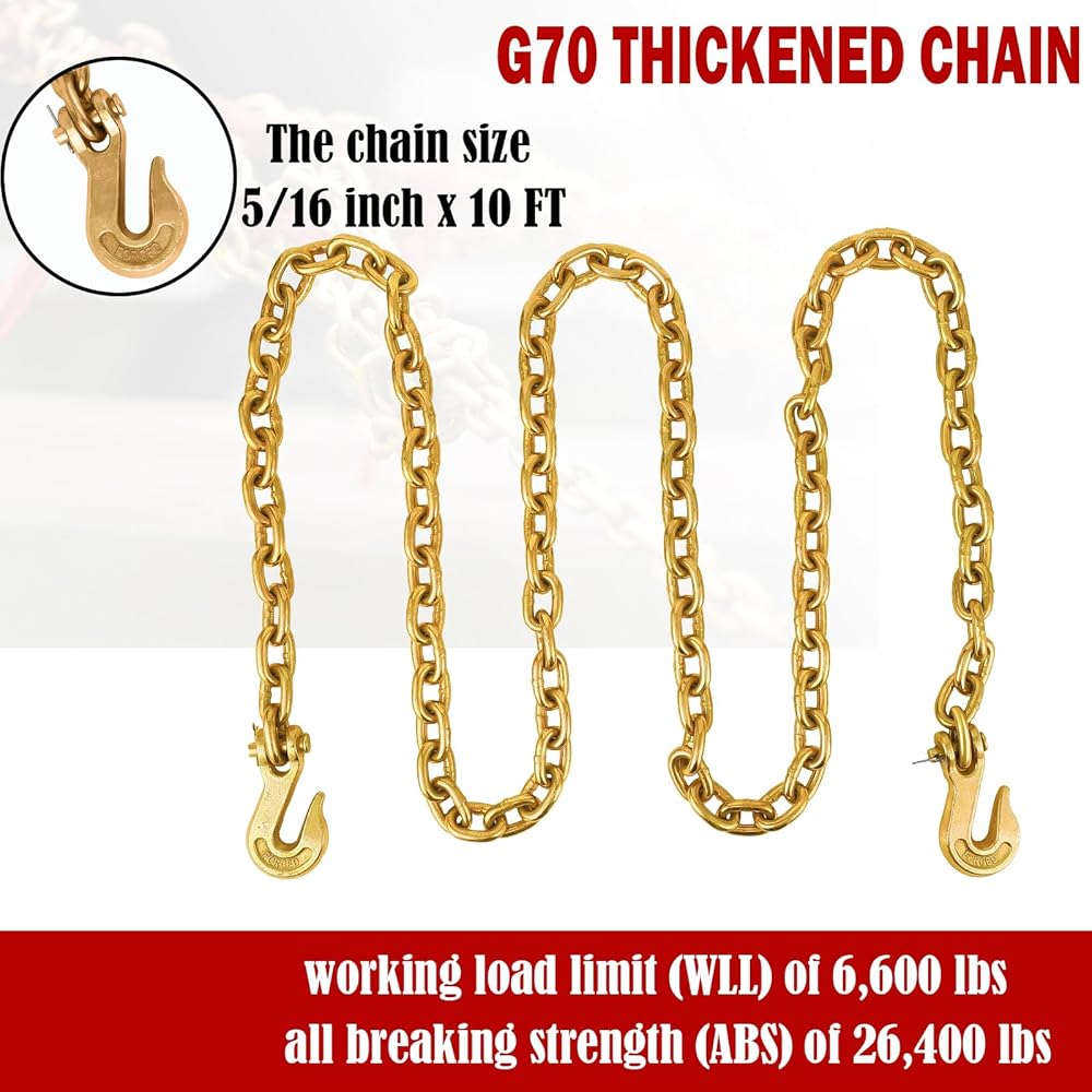 【High Quality Material】 The chain binder is made of high quality forged steel and the surface of the chain is galvanized, which gives the product better corrosion and abrasion resistance, thus prolonging its service life. Meanwhile, the upgraded heavy-duty G70 5/16-inch x 10-foot transport chain can provide higher safe working load.
