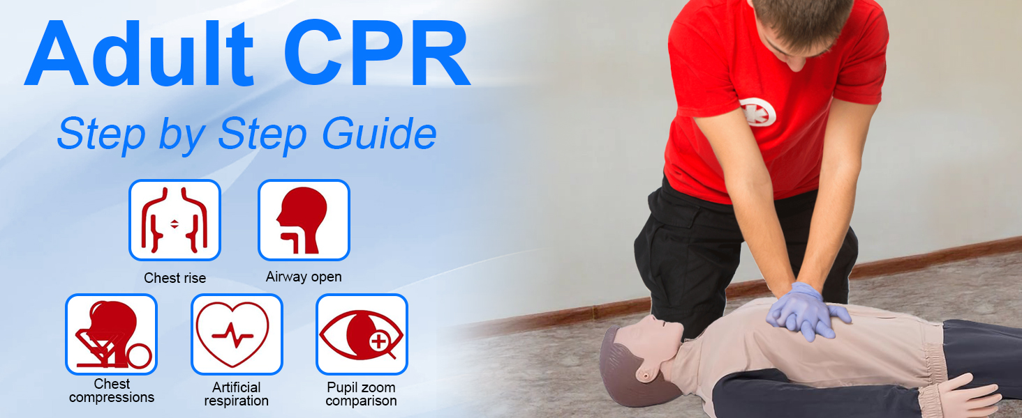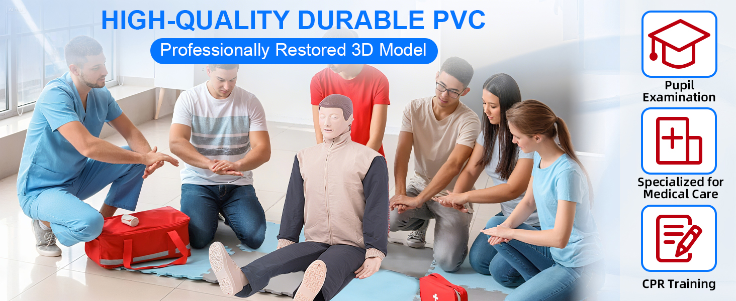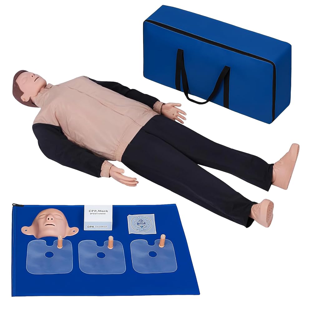 PACKAGE INCLUDES: These cpr training manikins are ready to use out of the box, including one advanced resuscitation full body mannequin, One advanced deluxe extra-thick Oxford bag, One resuscitation operation mat; Barrier mask (50 sheets / box) a box, Four sets of interchangeable lung bladder devices, Exchangeable face skin; One copy of the first aid manual, One copy of the instruction manual
