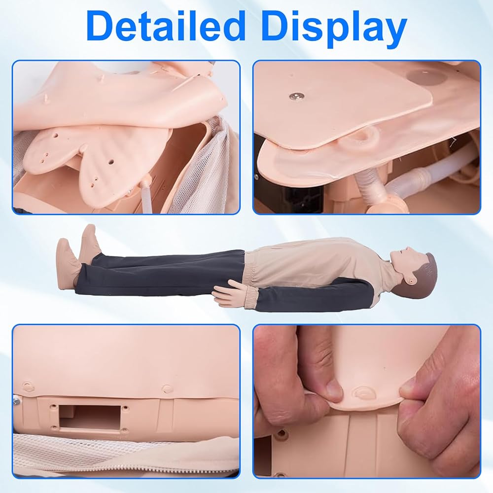 HIGH-FIDELITY DESIGN FOR AUTHENTIC TRAINING EXPERIENCE: Engineered with a lifelike representation of human anatomy, the medical mannequin for training features realistic chest landmarks, head tilt, chin lift, jaw thrust capabilities, and observable chest rise during ventilation. This design allows trainees to practice techniques that closely mirror real-life scenarios, building confidence and proficiency