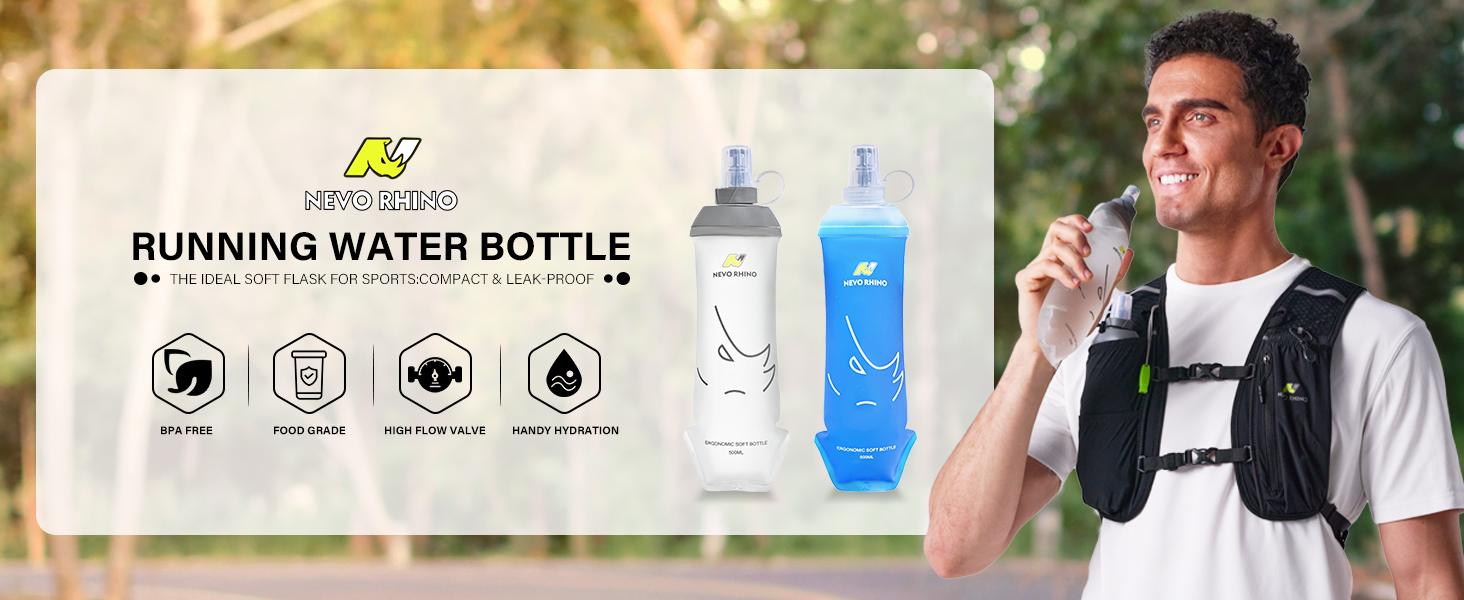 【Foldable Water Bottle】This collapse water bottle that fits easily into the pockets of your hydration vest and running backpack.This pocket water bottle is ergonomically shaped for a comfortable grip and body fit.N NEVO RHINO soft water bottles features a secure leak-proof mouthpiece, making it an ideal hydration solution for runners