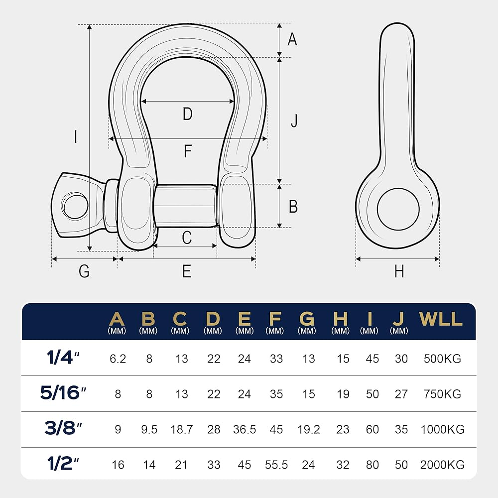 Multiple Sizes to Fit Your Needs: Available in 1/2", 3/8", 5/16", and 1/4" sizes. Each size comes in a 4-pack of bow shackles, the working load limit (WLL) of the 1/4" shackle is 500 KG (1100 LB).