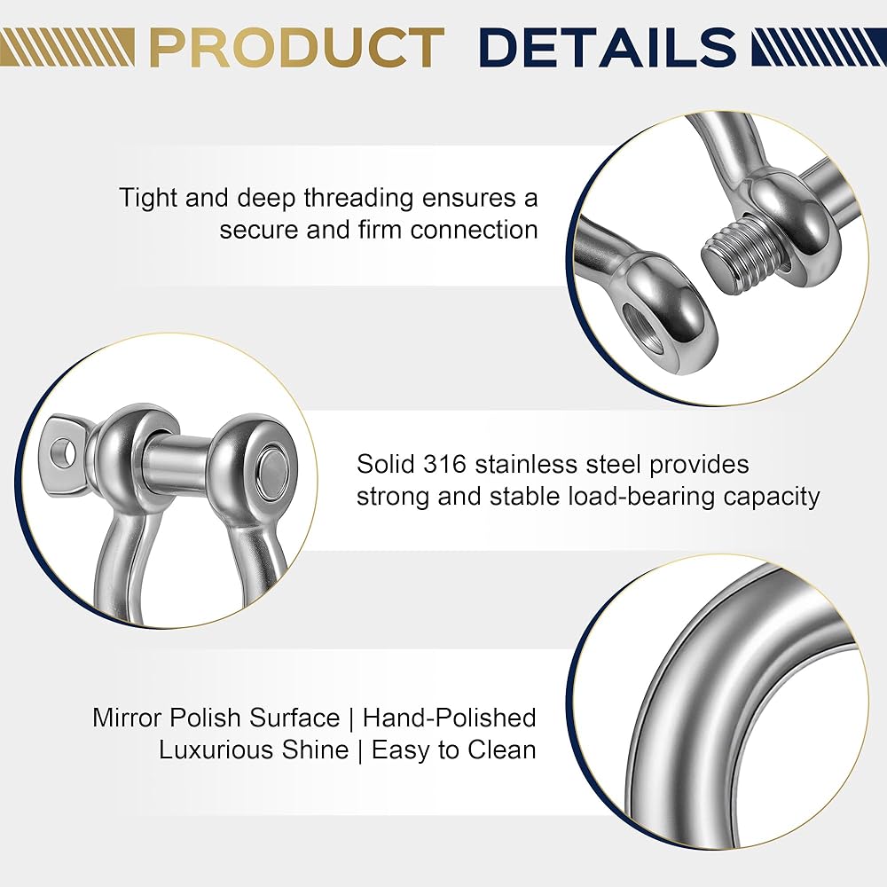 Premium 316 Stainless Steel for Marine Environments: Constructed from true 316 marine-grade stainless steel, these D shackles deliver maximum resistance to saltwater, chemical exposure, rust, and long-term outdoor use.