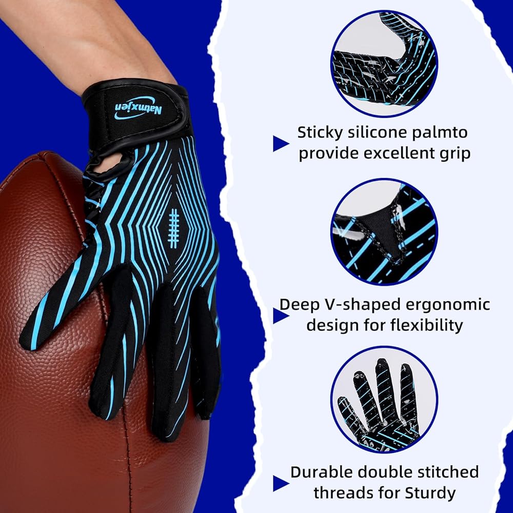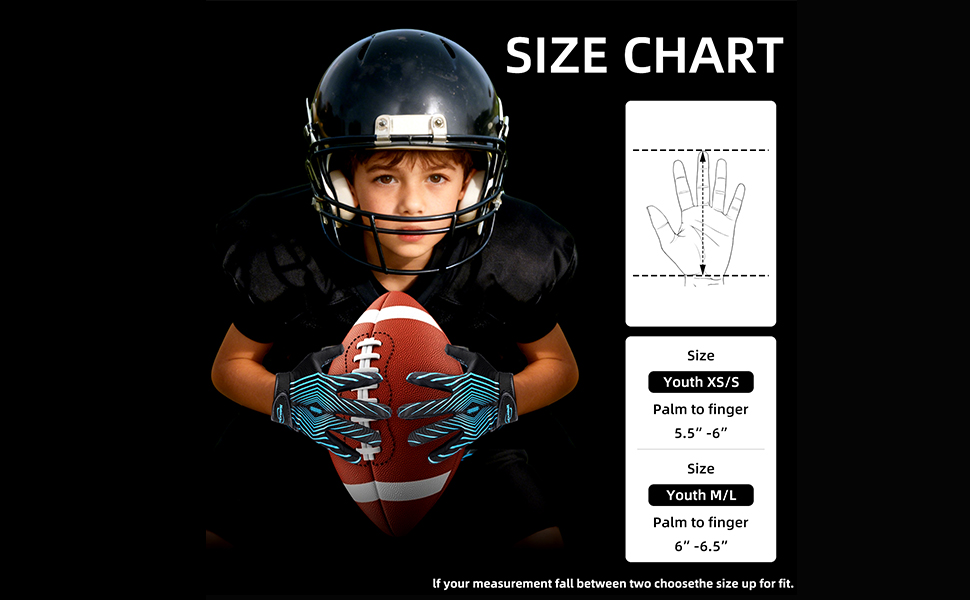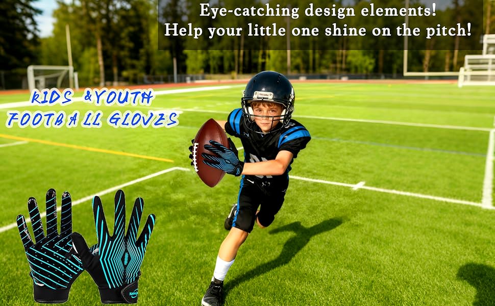 STICKY GRIP BOOST--Our gloves feature an advanced sticky palm grip that acts like a magnet to the football. It gives kids the unshakable confidence to make those game-changing catches, rain or shine. With superior control and a secure fit, we're here to minimize fumbles and maximize playmaking—turning your young athlete into a more confident and dominant force on the field.