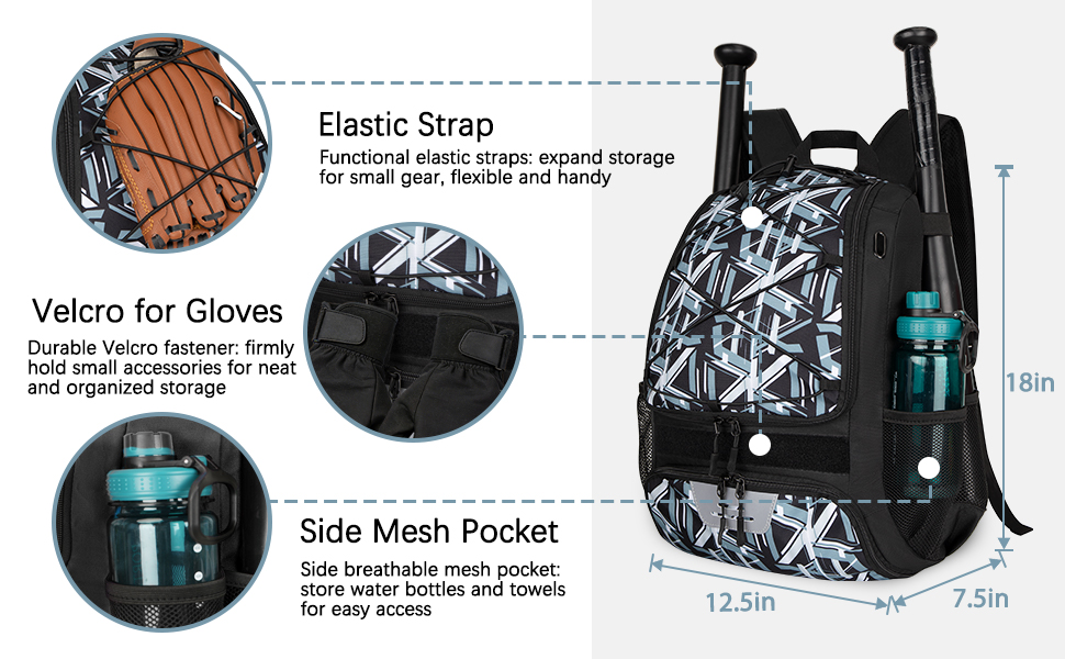 1. Large Capacity & Organized Storage:Spacious main compartment fits helmet, gloves, cleats and uniforms. Designed with 2 bat sleeves, ventilated shoe compartment and side mesh pockets. Keep all baseball and softball gear organized for practice, games and daily use.