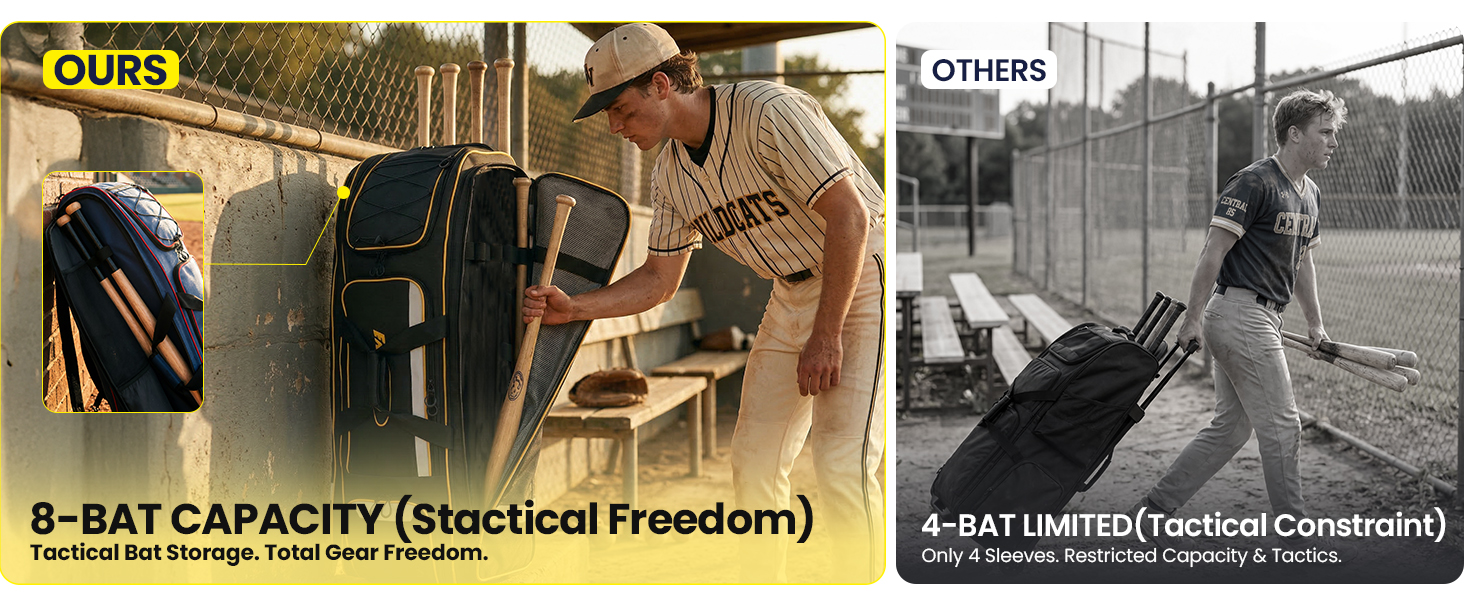 Spacious 100L & Zoned Organization: Stop struggling with undersized bags! This massive 100L catchers gear bag features 3 separate zippered zones— a dedicated helmet zone, a cavernous main compartment, and a ventilated cleat zone. Inside, stay organized with 8 bat sleeves, 4 mesh pockets, 2 open pockets, and 2 zippered wet/dry separation pockets to isolate sweaty layers, and a removable divider to end equipment chaos instantly!