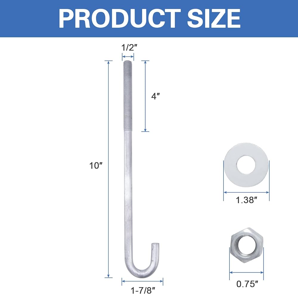 - 1/2 in. x 10 in. J bolts concrete anchor bolts, 25-piece. Thread length: 4 in. Includes nuts and USS washers