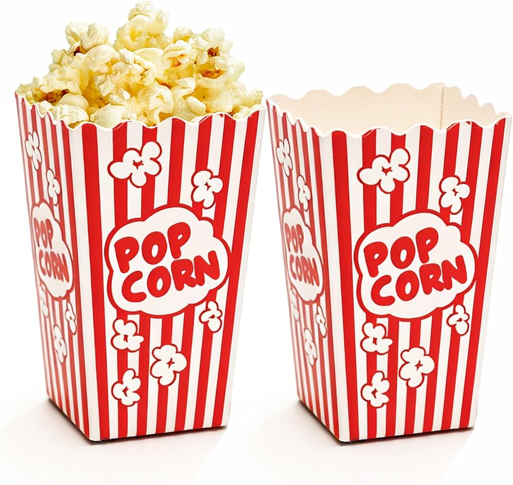 Homrelaxy 54Pcs Mini Popcorn Boxes, Small Popcorn Containers Buckets for Pop Corn Machine, Movie Night, Cinema, Carnival, Party, Concessions VALUE PACK: Package contains 54 Mini popcorn boxes, each paper popcorn square bucket measures 2.64" x 1.97" x 4.6". FOOD-GRADE MATERIAL: Our popcorn buckets are made of food-grade cardboard material, sturdy, clean, and hygienic. EASY TO FOLD: The bottom of the popcorn box is effortless to fold up. Only one step to make it stand up. CLASSIC DESIGN: These paper containers for popcorn feature a classic design of red and white vertical stripes, perfect for all kinds of parties and festive atmospheres. WIDE RANGE OF USES: Bulk popcorn boxes are versatile and can be used in movie theaters, movie nights, parties, carnivals, amusement parks, snack stores, and at home.