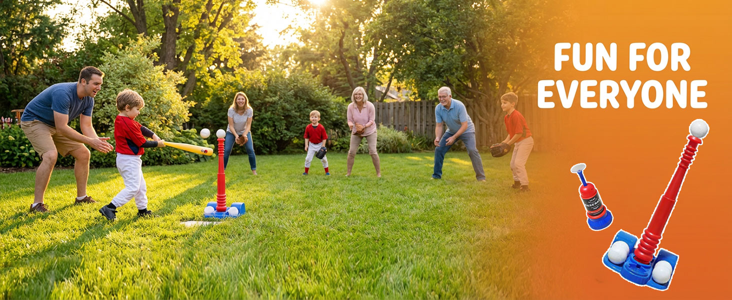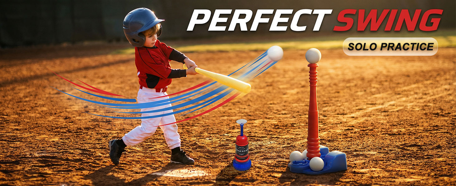 ADJUSTABLE TEE BALL SET Perfect for young athletes just starting their baseball journey, this set features an adjustable-height tee that grows with your child's developing skills. Includes 6 oversized 4-inch baseballs, a kid-friendly bat and tee, plus a convenient storage bag—everything your little slugger needs to start swinging from an early age.