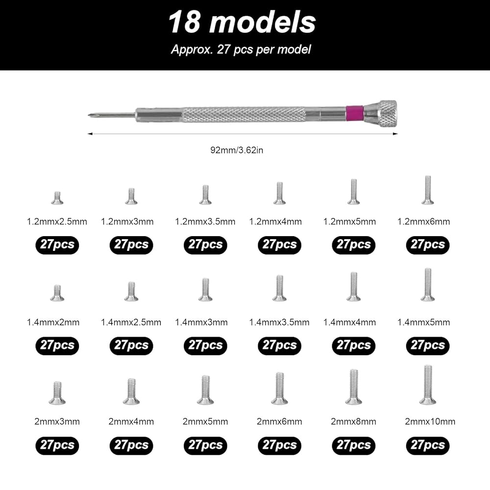 Package Includes: A total of about 500 pieces tiny screws, 27 pieces of each size, m1.2 x 2.5mm/3mm/3.5mm/4mm/5mm/6mm, m1.4x2mm/2.5mm/3mm/3.5mm/4mm/5mm, m2 x 3mm/5mm/6mm/8mm/10mm, Meet the needs of use in multiple fields