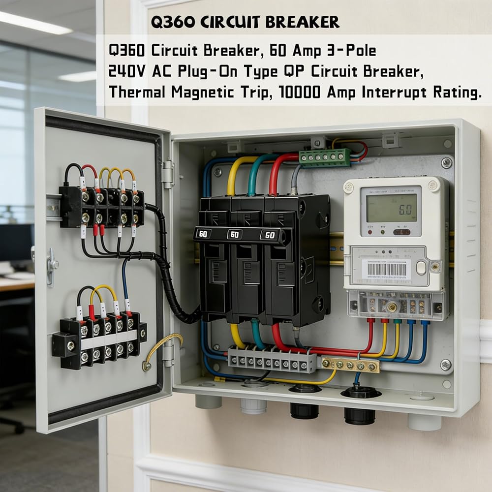 Q360 STANDARD CIRCUIT BREAKER: Q360 Circuit Breaker 3-pole, 60-amp, 120/240v, is a circuit protection load center power, feeder and mi niature circuit breaker. Rated at 60 amps. Rated for 240V.