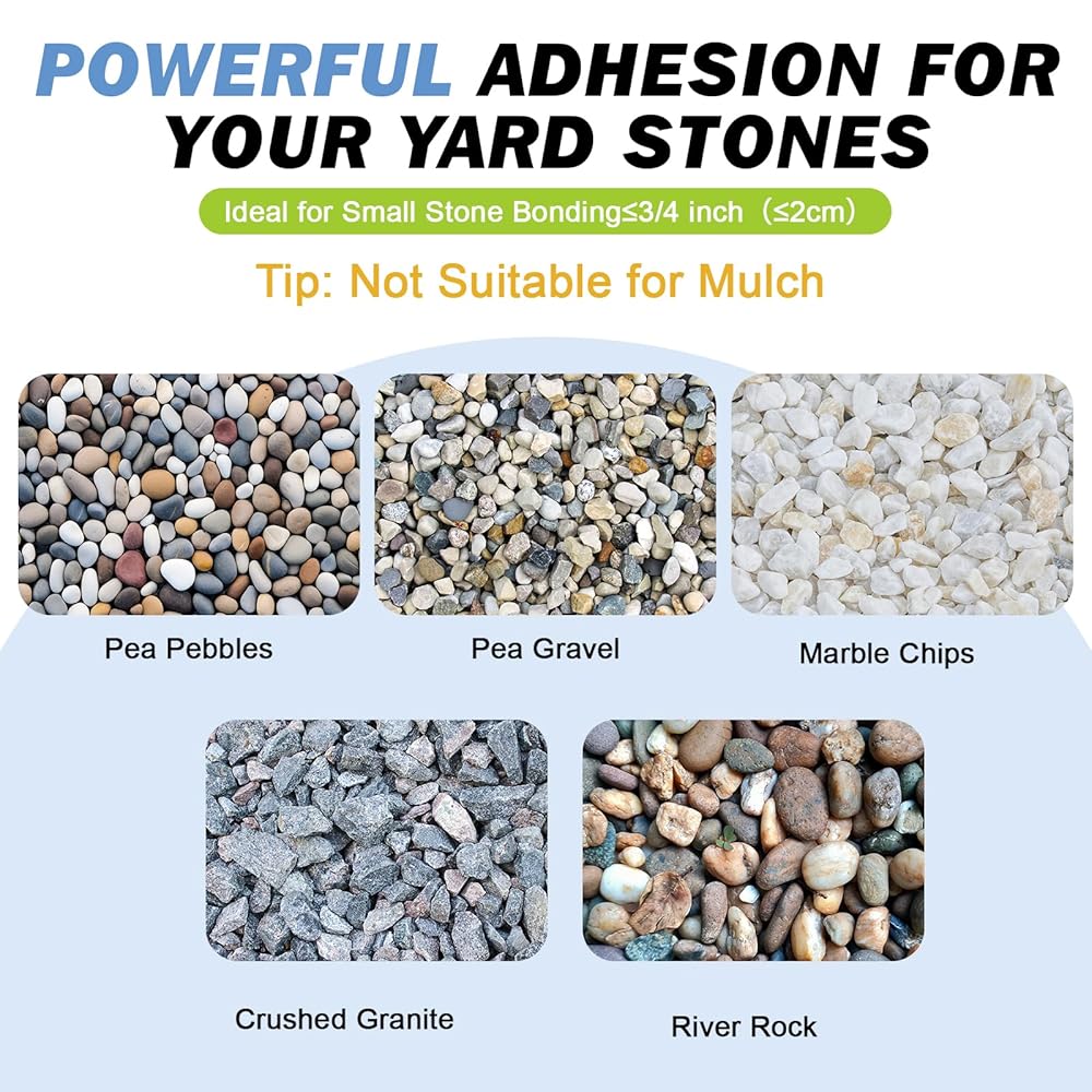 Designed for Landscaping & Low Foot Traffic Walkways - This outdoor landscape glue works with pea gravel, pebbles, river rock, decomposed granite, and other small decorative stones. Ideal for walkways, pathways, garden beds, around the house, driveway edges, patios, and decorative landscaping areas. Not suitable for mulch, wood chips, rubber mulch, or high-traffic driveways.